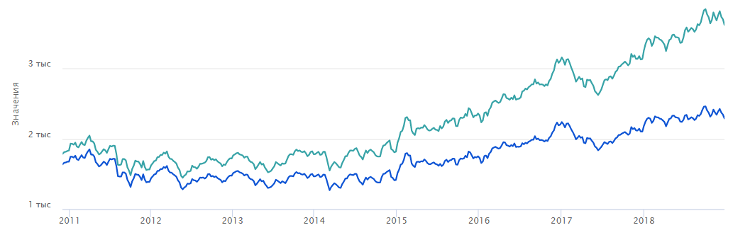Но результаты различные. Начиная со 100 пунктов (правда с разницей в 2 года) — индекс РТС перешагнул за 1 000 пунктов. А IMOEX далеко за 2 000.