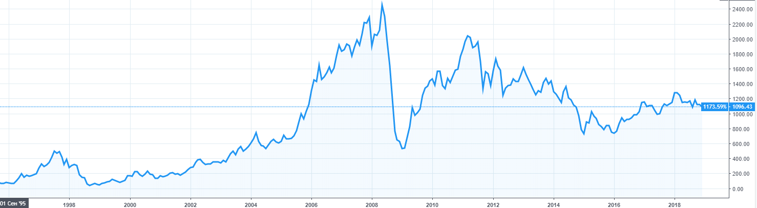 Даже с учетом общей доходности +1175% с момента основания индекса в 1995 году, мы видим, что последние несколько лет идет топтание на месте. С небольшим уклоном вниз.
