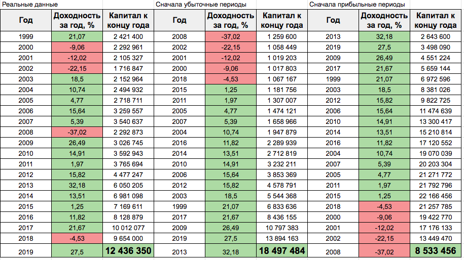 В первом случае (реальные данные — таблица слева) мы получили более 12 миллионов. Среднегодовая доходность — 6,8%