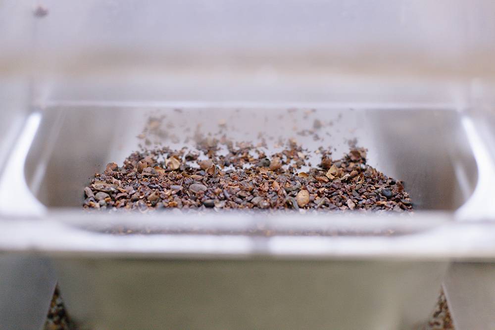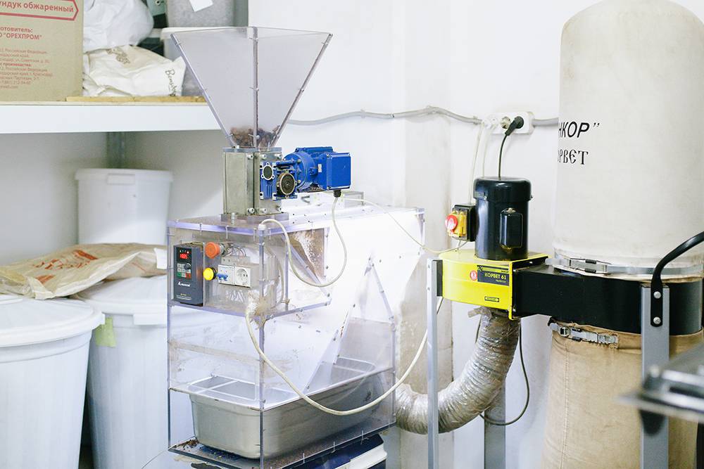 Дальше с бобов убирают внешнюю оболочку — веллу. Она жесткая и плохо перемалывается. Справиться с ней помогает сепаратор — это гибрид дробилки и ветродуя. Специальный вал в сепараторе ломает бобы — получается крупка. Она проваливается вниз, а легкая велла улетает в потоке воздуха и собирается в специальном отсеке.