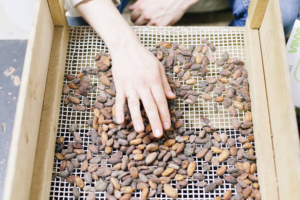 Работу над ремесленным шоколадом начинают с того, что вручную перебирают бобы и удаляют биомусор: недоразвитые бобы, зеленый кофе, веточки и обрывки нитей от мешка.