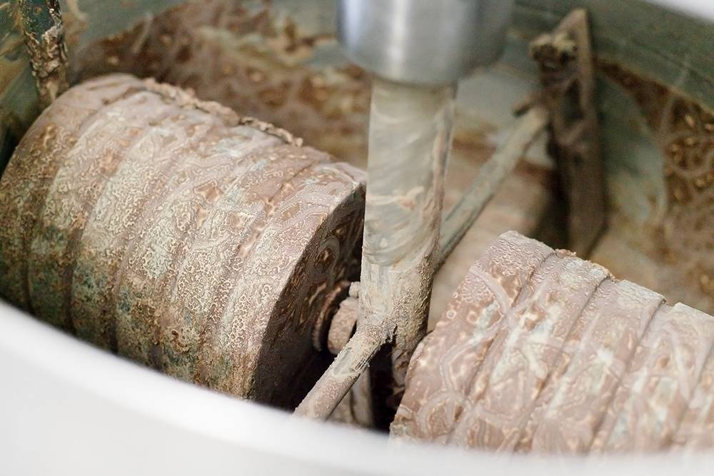 Очищенную крупку перетирают в мельнице-меланжере вместе с сахаром и какао-маслом 48 часов. За это время частицы уменьшаются до 30 микрон — такой шоколад рецепторы воспринимают как однородную массу.