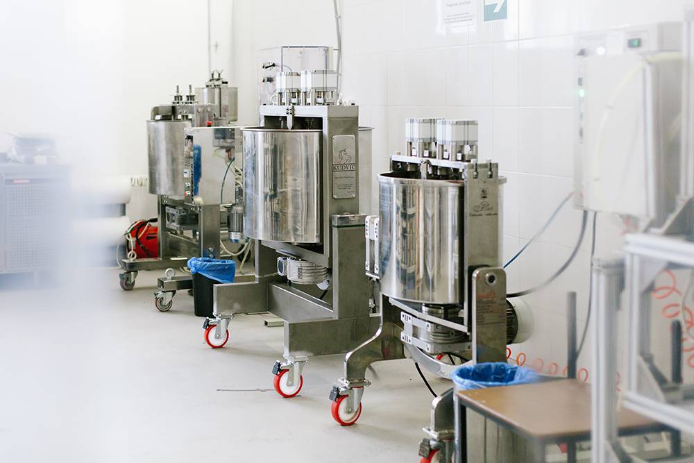 Линия занимает 4 м² — в месяц на ней делают 10 тысяч плиток. Лучше всего разливать на линии темный шоколад с содержанием какао выше 70%: он более текучий. Для остальных сортов используют темперирующую машину — на ней формы заполняют вручную через специальную насадку.