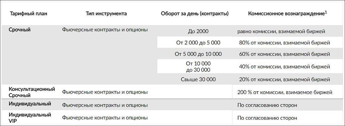 - от 20% от комиссии биржи для сделок на срочном рынке;