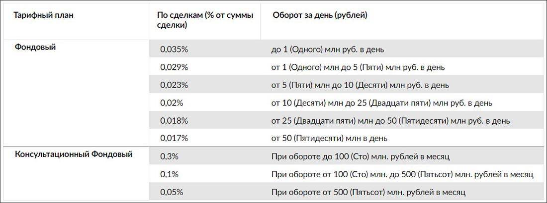 Тарифный план «Фондовый» рассчитан на активных трейдеров. Комиссия брокера зависит от дневного оборота: от 0,035% до 0,17% от суммы сделки.