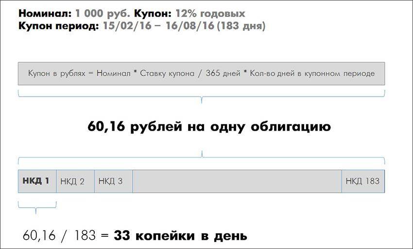 Размер НКД можно рассчитать и самостоятельно, зная номинал, ставку купона в процентах и дату последнего зачисления выплаты. Базовая формула расчета по российским облигациям выглядит так: