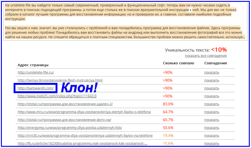 Проверить наличие страниц клона в индексе Яндекса можно поисковым запросом: