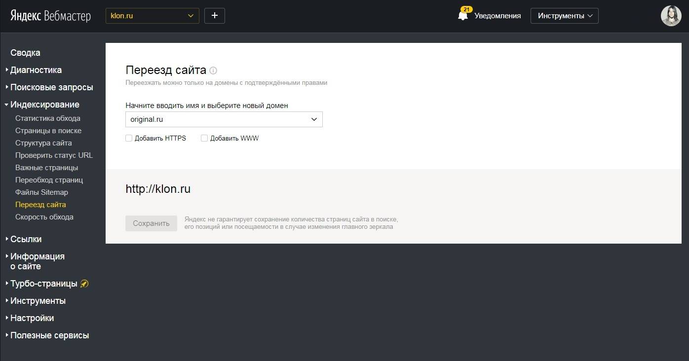 В Яндекс.Вебмастере после подтверждения прав на клон, в разделе Индексирование → Переезд сайта осуществляем перезд (склеиваем зеркала). Поскольку переезжать можно только на домены с подтверждёнными правами, оригинальный сайт также должен быть добавлен в Яндекс.Вебмастер.