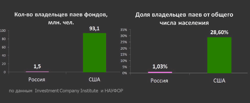 Итого, в России насчитывается более десятка различных видов ПИФ, из которых преобладающими являются фонды недвижимости и акций. При этом в плане выбора активов расхождение американских и российских инвесторов не такое большое, хотя россияне настроены более консервативно — облигации являются для них приоритетным инструментом, тогда как в США в акции инвестируют почти в два раза чаще. Однако если посмотреть на количество владельцев паев, то снова обнаружится громадное преимущество США: