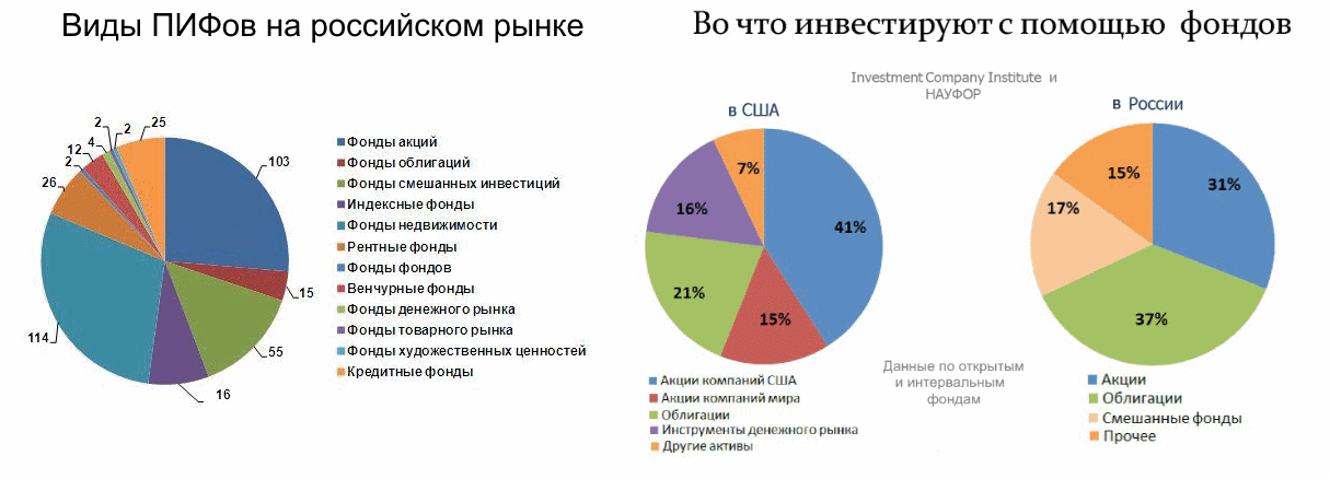 Интервальные паевые фонды пользуются наименьшей популярностью — их число заметно меньше числа как открытых, так и закрытых фондов. Общее количество ПИФ перевалило за тысячу — но в последние три года почти не растет, что дает основание говорить, что рынок близок к насыщению. Стоимость чистых активов указывает на доминирование закрытых структур, которые как правило используются для инвестиций в недвижимость. Посмотрим теперь подробнее на виды и активы ПИФ, т.е. во что именно инвестируют держатели паевых фондов в России и США: