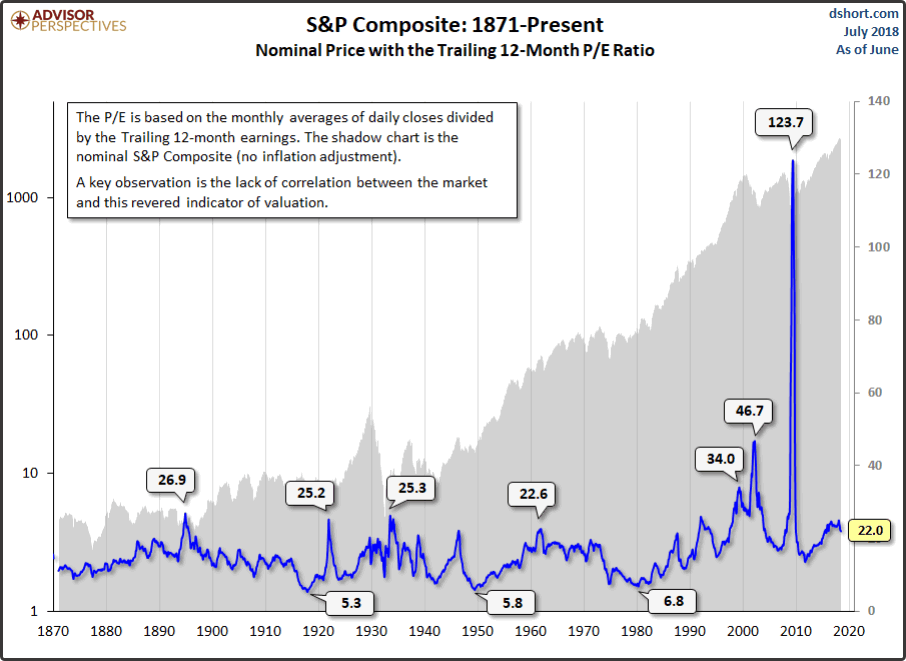 Огромное значение коэффициента (более 120) в моменте кризиса 2009 года обусловлено как раз крайне резким сокращением прибыли, из-за чего акции, несмотря на свое падение, дали еще большее значение P/E, как и при очень бурном росте. Хотя резкий подъем P/E при надувании «пузыря доткомов» в 2000 году действительно указывал на выход из рынка, но последовавший за ним ипотечный кризис 2008 года начался при стандартном значении коэффициента — благодаря чему был «проворонен» многими аналитиками.