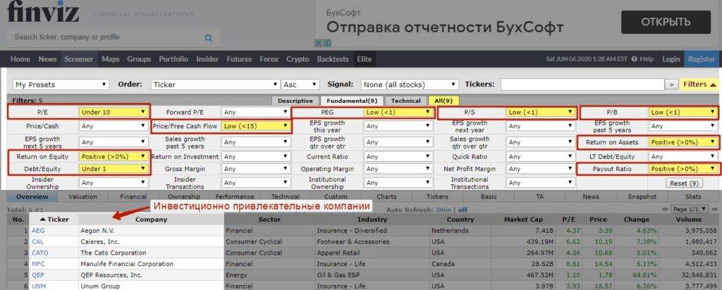 Оперативно оценить компании по фундаментальным показателям можно с помощью сервиса Finviz.com. На рисунке ниже я показал применение всех разобранных мультипликаторов на практике оценки недооцененных акций. Были выставлены жесткие условия по нормативным значениям. В результате отразились компании, удовлетворяющие требованиям фильтров.