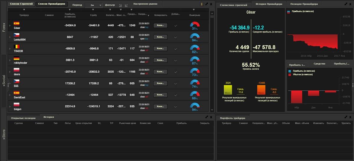 XSocial. Торговая платформа на базе терминала XStation брокера AMarkets, позволяющая копировать сделки других трейдеров. Причем комиссия за копирование не взимается. Вознаграждение поставщиков сигналов заложено в спрэд. На ваш выбор представлено более 1500 провайдеров со всего мира, которые проходят тщательную процедуру отбора.