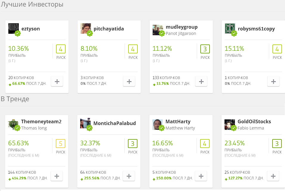 Сервис копирования EToro полностью бесплатный для инвестора. Это одна из самых крупных площадок в мире, предназначенных для социальной торговли. Здесь сосредоточено большое количество трейдеров из разных стран мира, однако сервис не рассчитан на инвесторов с небольшим капиталом. Необходимая сумма для копирования сделок со счета одного трейдера стартует от 200$.
