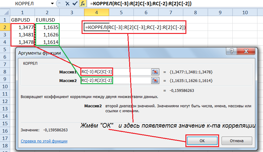 Нажимаем «ОК» и получаем искомое значение корреляции. На рисунке выше показан наглядный пример. Для простоты отображения в колонки внесены всего по три значения котировок. На самом деле, для получения достаточно точных результатов, необходимо вносить данные за гораздо больший период времени (как минимум по 50-100 котировок).