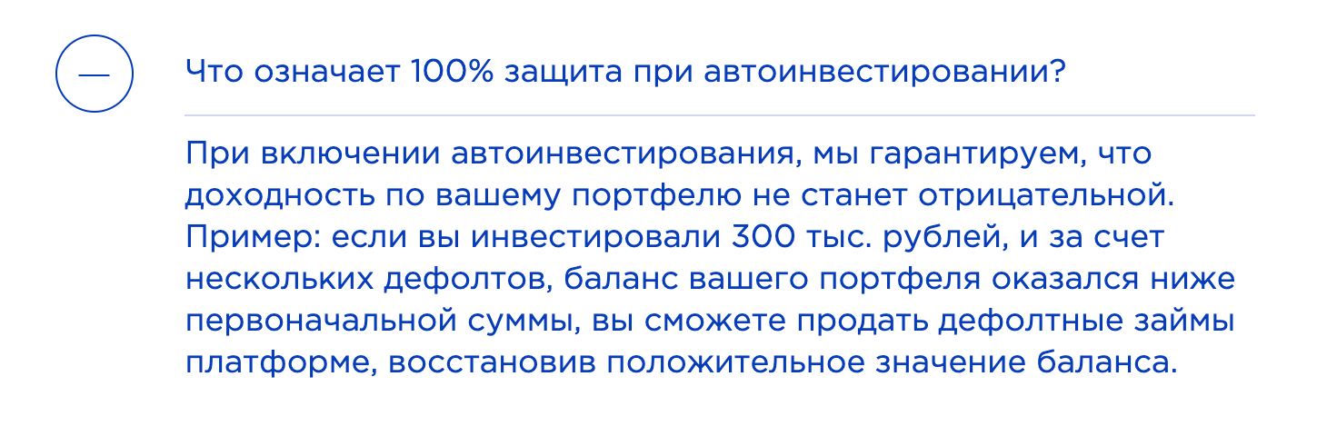 Судя по сайту площадки, при автоматическом распределении средств работает гарантия безубыточности. Если кто-то из заемщиков перестает платить и инвестор теряет вложенные деньги, площадка выплачивает инвестору долг этой компании — он теряет только проценты. С учетом повышенной доходности инвестиций через краудлендинг такая гарантия выглядит привлекательно.
