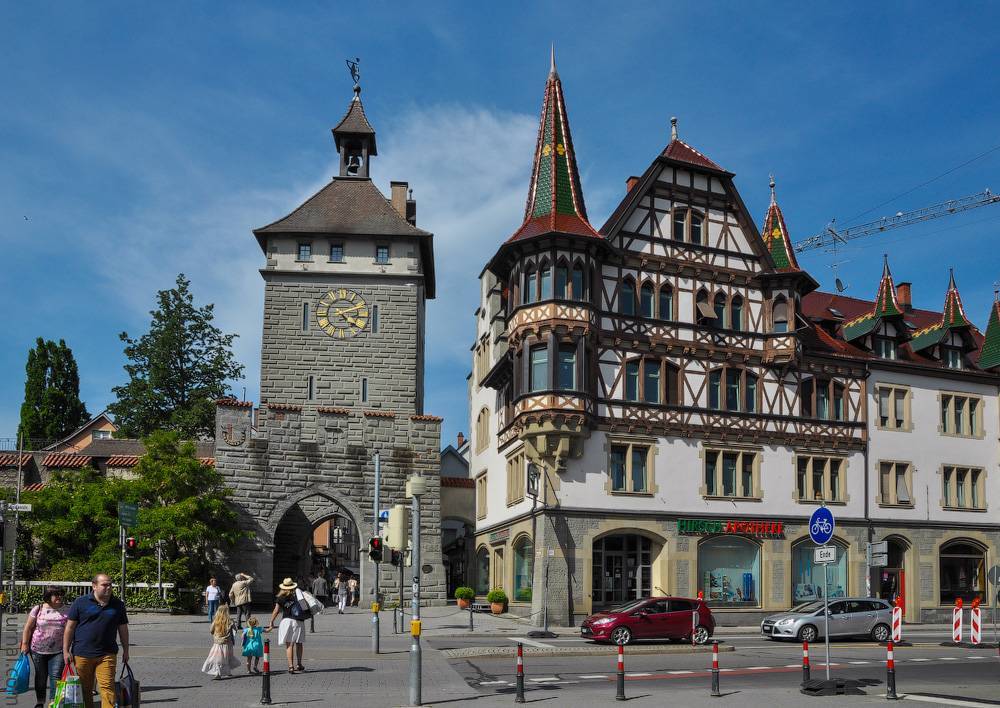 Самым «антинемецким» пограничным называют город Констанц. Здесь всегда туристы, и жизнь не затихает даже ночью. Он делится пополам с соседней Швейцарией, и ее часть носит уже название Кройцлинген. Обе части города ежегодно устраивают на Боденском озере дружественный салют. Констанц печально знаменит тем, что в Средние века здесь был сожжен на костре инквизиции реформатор Ян Гус.