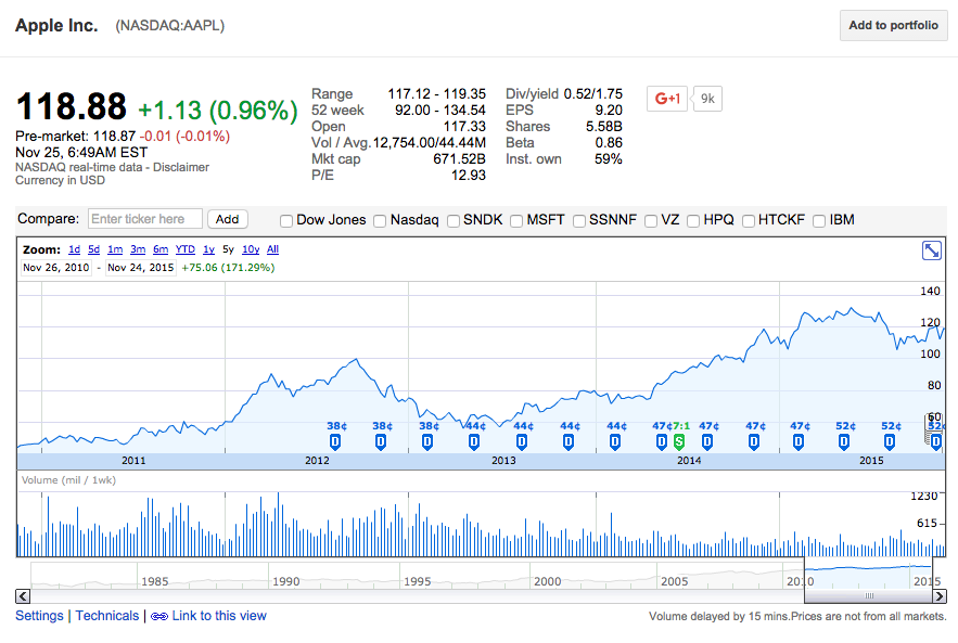 Покопайтесь на «Гугл-финансах». Этот ресурс показывает котировки компаний за любой период. Можно посмотреть, насколько выросли «Эпл», «Ситигруп», «Тесла» и «Бёрбери» с момента первой продажи акции и за последний день: