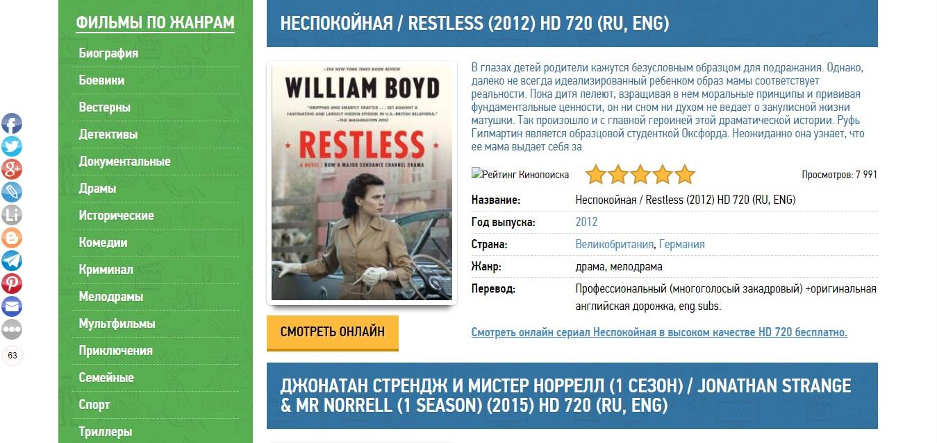 Прекрасный сайт с большим выбором фильмов, сериалов и мультфильмов на любой вкус. Для удобства пользователей есть возможность сортировать их по жанру или стране. Кроме того, представлены варианты не только с английскими субтитрами, но и с русскими или же вовсе без них.