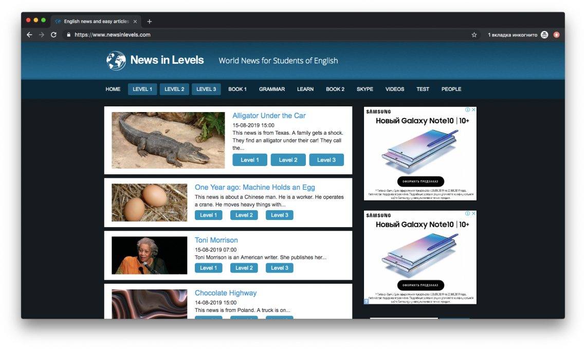 «Читайте новости на английском» — популярный совет от преподавателей языка. Он неплохой, но для неподготовленного человека с уровнем «учил в школе восемь лет назад» новости на The New York Times или The Washington Post, или даже на BBC — непосильная задача. С этим поможет сайт newsinlevels.com.