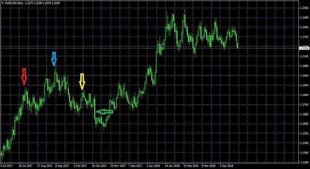 На этом дневном графике пары евро-доллар явно прослеживается фигура “голова и плечи”. Левое плечо отмечено стрелкой красного цвета, правое — желтого, а голова — синим цветом. Стрелкой зеленого цвета указан желаемый момент входа в рынок для игры на понижение.