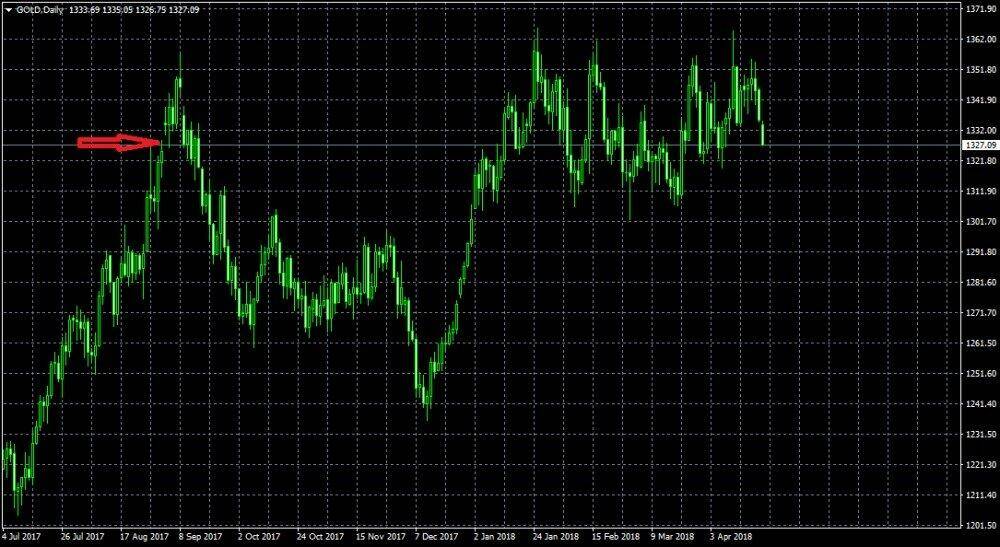 На дневном графике золота красной стрелкой отмечен гэп. Но разрывы в цене на “золотом” рынке случаются редко. На фондовом рынке разрывы в цене случаются чаще, чем на рынке драгоценного металла. Использовать мартингейл-стратегию лучше в направлении движущегося тренда, а не против него.