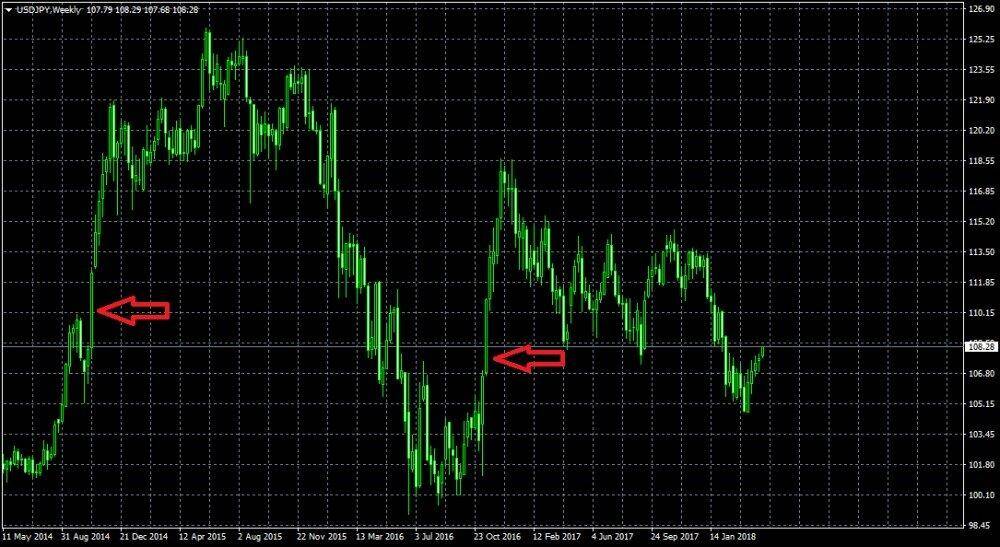 Ход рынка часто сменяется контр-ходом. Менее интересной является пара доллар США — иена и евро — доллар, но и на них удобно работать из-за небольших комиссионных расходов. У USDJPY достаточная волотильность, хотя на недельном графике доллар США- иена видно, что иногда японская валюта надолго устремляется в одном или другом направлении.