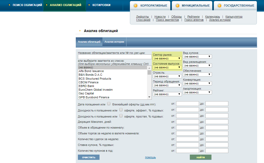 Чтобы на «Русбондс» найти субфедеральные облигации, нужно перейти в раздел «Анализ облигаций», выбрать параметры поиска «Сектор рынка» — «Муни», «Состояние выпуска» — «В обращении» и нажать «Найти»