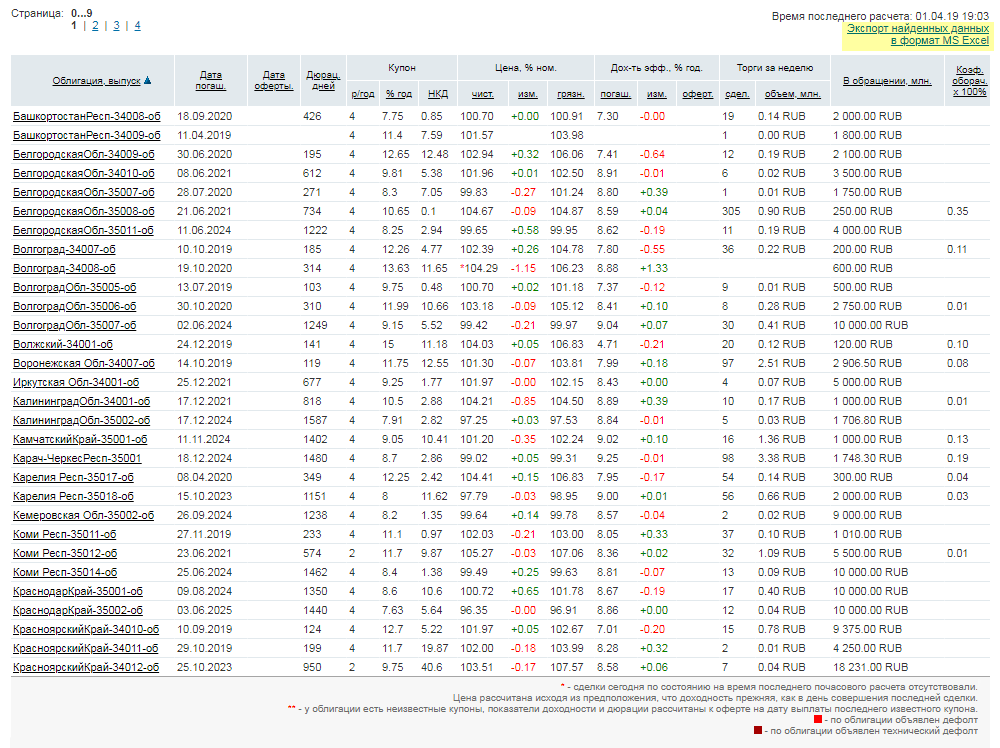 В нижней части экрана сформируется таблица с облигациями по заданным параметрам