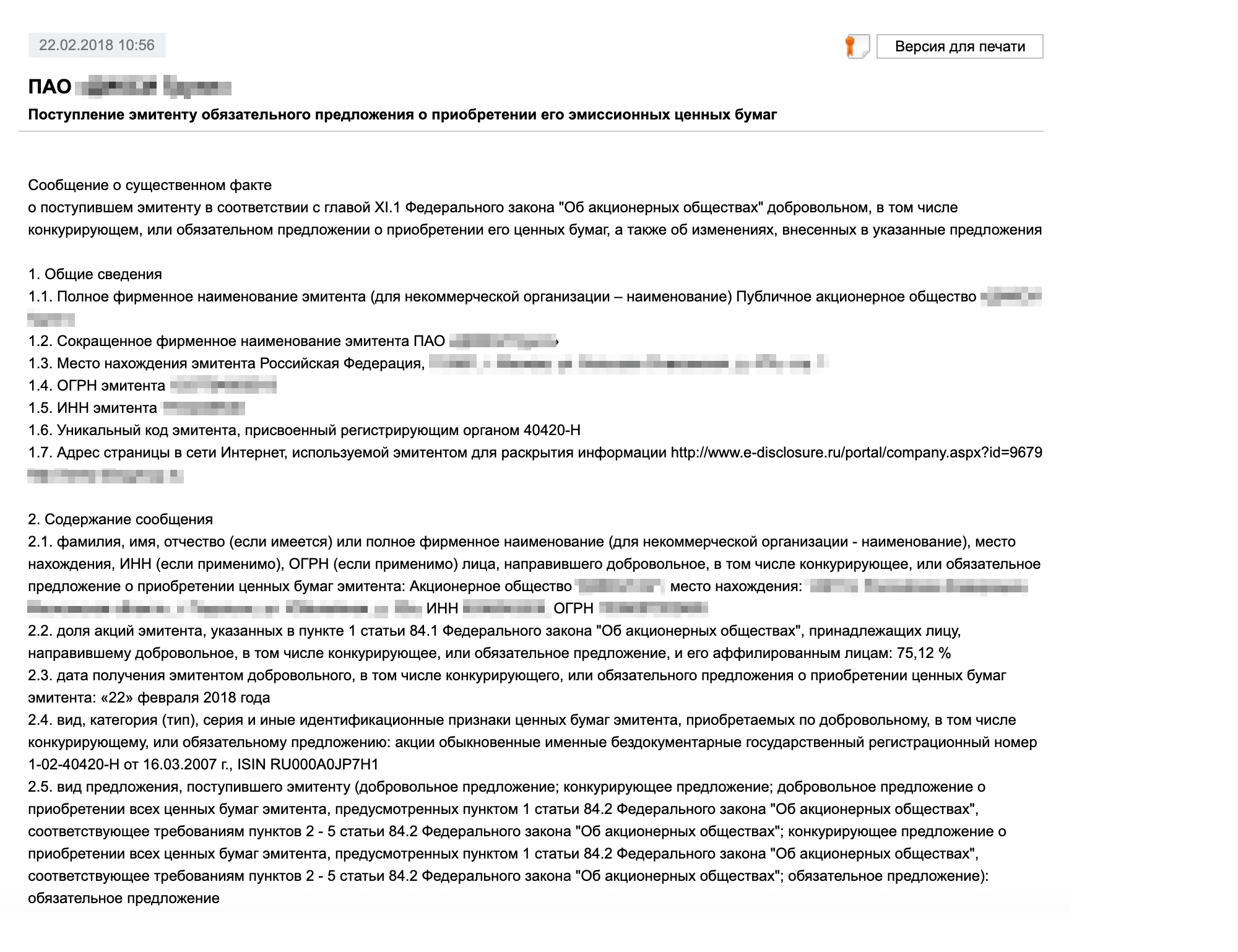 - Доля акционера превысила 95% в результате покупки минимум 10% акций по добровольному или обязательному предложению. И вот тут придется рассказать подробней.