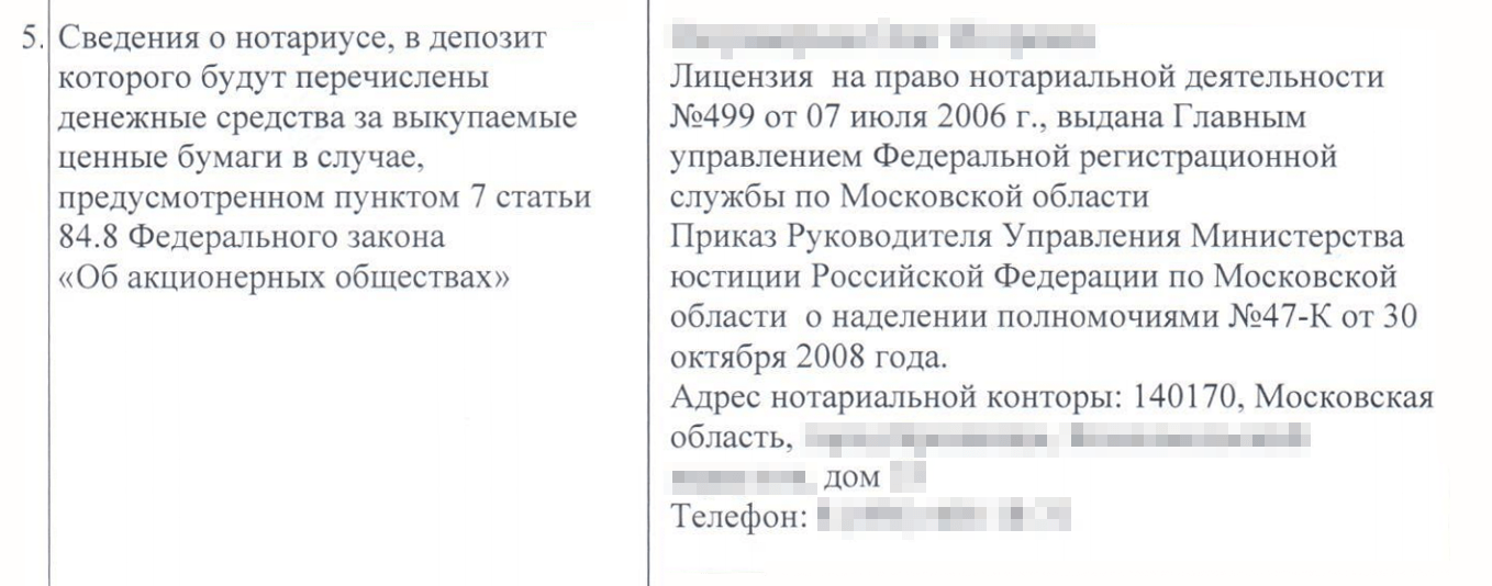 Информация о нотариусе в требовании о выкупе акций ОАО «Бронницкий ювелир»