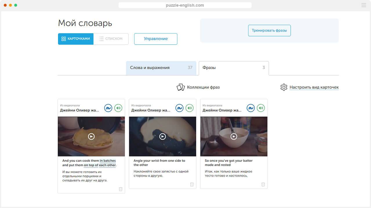 Новые слова и выражения можно сортировать разными способами: в виде списка с озвучкой и примерами употребления, а также в виде карточек, когда можно посмотреть видео с использованием слова, перевод, послушать озвучку.