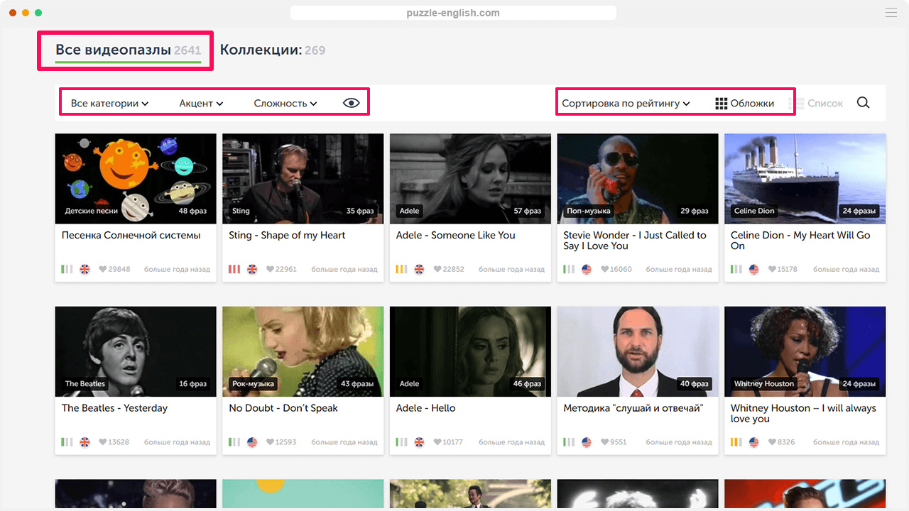 Пользуйтесь сортировкой на сайте. Выбирайте видеопазлы по интересным темам и категориям, тестируйте сложность материала или смотрите видео с определенным акцентом.