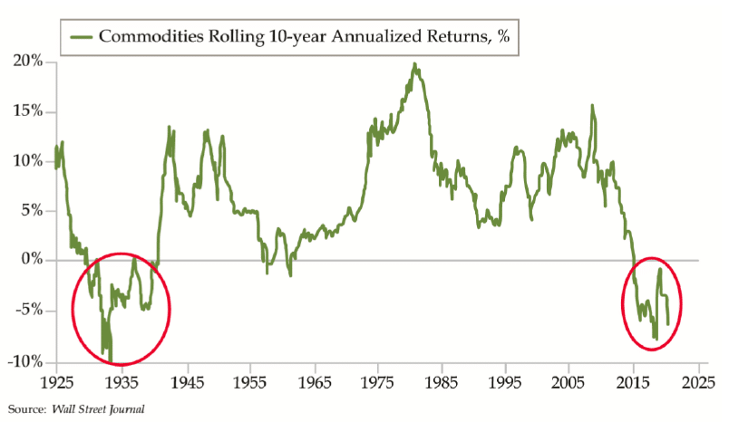 Динамика аннуализированной доходности сырья за последовательные 10 лет