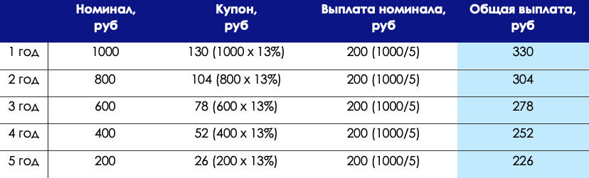 Есть амортизационная облигация с показателем амортизации 200 руб. в год, со сроком погашения через 5 лет и купоном 13%. Номинальная стоимость облигации составляет 1 000 руб.