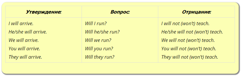 Говорит о событиях, которые еще не произошли. Образуется одинаково для всех лиц — путем добавления вспомогательного глагола will + базовый глагол.