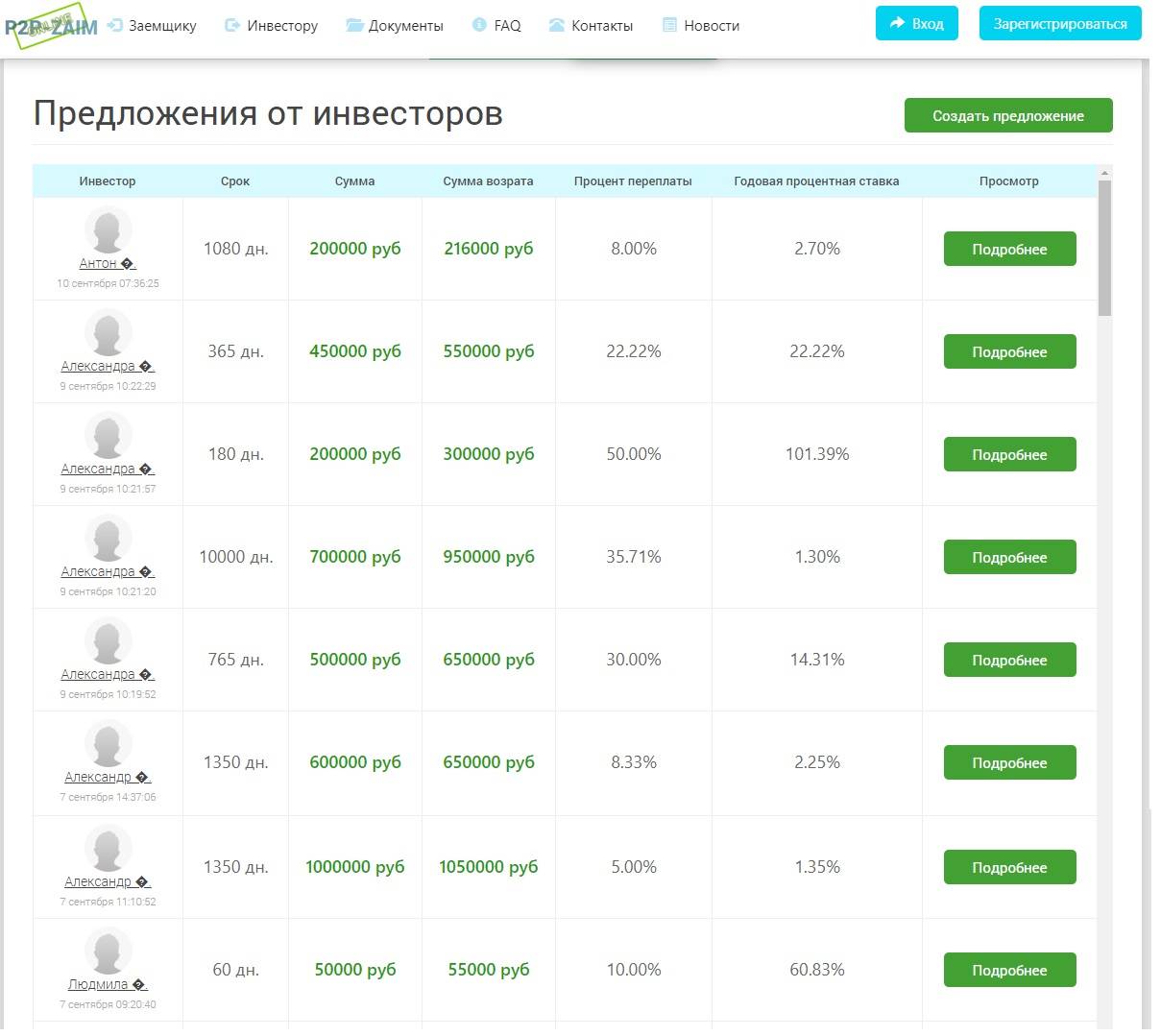 После регистрации можно просмотреть последние заявки на предоставление займа и предложения инвесторов.