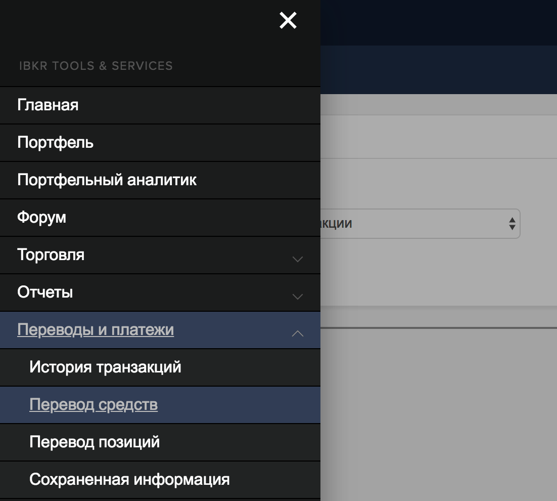 Для пополнения в рублях необходимо создать уведомление о переводе (его необязательно предоставлять валютному контролю банка, но IB сообщает, что так средства быстрее будут идентифицированы и зачислены на счет). Для создания уведомления в личном кабинете переходим Меню — Переводы и платежи — Перевод средств.