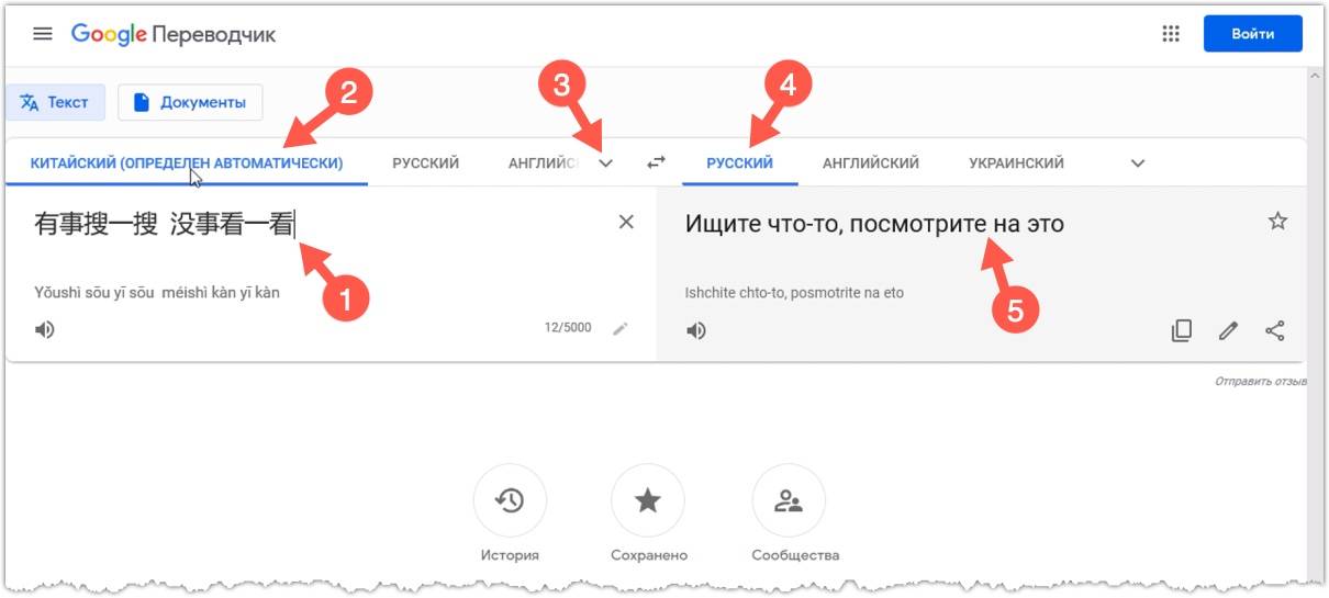 Во-первых, когда мне нужно посмотреть перевод какого-то слова или фразы, то я просто копирую нужный текст, перехожу на сайт Google Translate и вставляю скопированный фрагмент в соответствующее поле (1). Сервис попытается самостоятельно определить язык (2). Если это ему не удастся, то можно задать язык вручную (3), выбрав его из списка. Далее выбираем нужный язык перевода (4) и получаем результат (5):