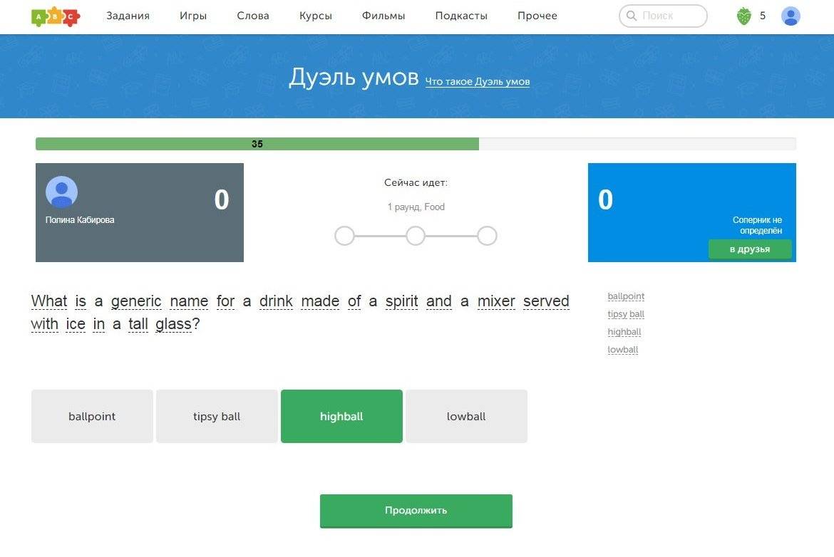Другой инструмент для изучения языка — игры. Например, дуэль умов. Там можно выбрать случайного соперника или друга и, соревнуясь, проходить викторины на разные темы.