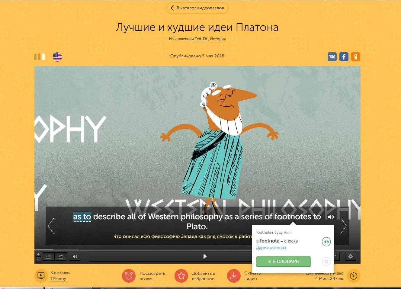 Так выглядит видео из раздела видеопазлов. При наведении на слово отображается перевод