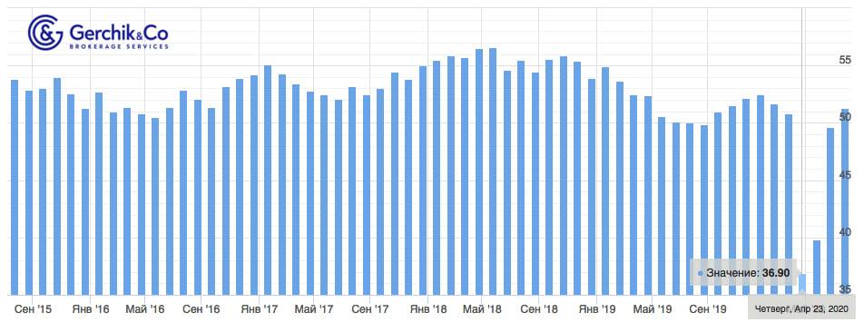 Во время карантина из-за пандемии коронавируса эти индикаторы «уходили» глубоко под уровень 50. Индекс деловой активности в производственном секторе PMI США от ISM в апреле падал до уровня 27,0, а индекс деловой активности в непроизводственном секторе PMI США от ISM достигал значения 36,90.