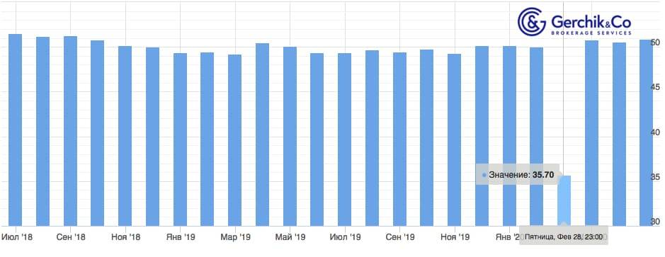 Далее помесячно: январь 2019 — 49,50, февраль — 49,20. Большую часть 2019 года промышленный PMI Китая находился ниже уровня 50, так как между США и КНР торговые отношения были напряженными.