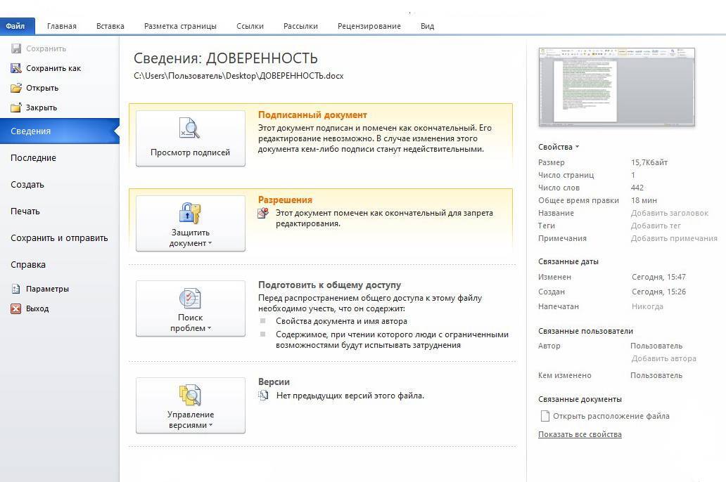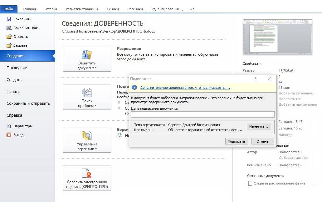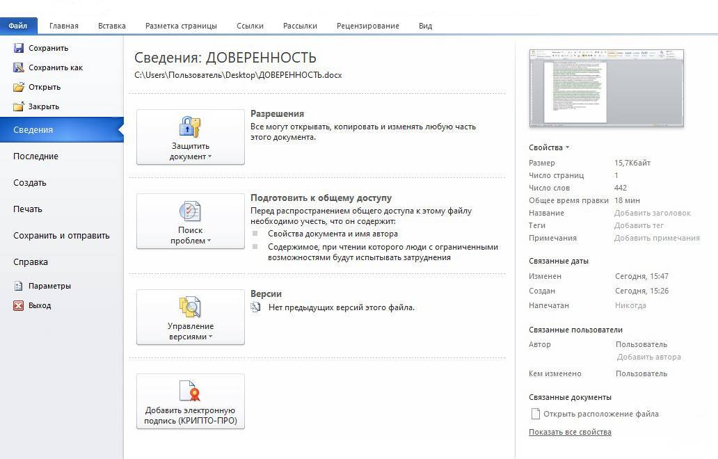 После того как текст доверенности будет готов, ее нужно подписать. Для этого необходимо зайти во вкладку «Файл» → «Сведения» и выбрать «Добавить электронную подпись».