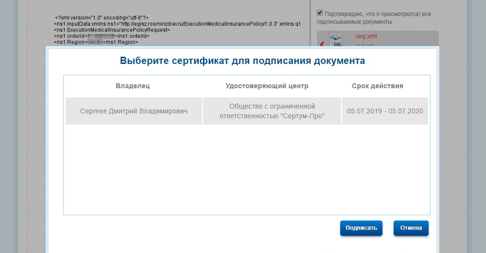 Затем система предложит подписать заявление. После нажатия кнопки «Подписать» система сама обратится к токену с ЭП и заверит все отправляемые документы