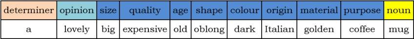 Морально подготовившись, можно «нырять» в эту тему глубже. Допустим, прилагательных два и оба они относятся к разным группам. А что если в предложении будет два или более английских прилагательных одной группы, какое же поставить вперед? Английская грамматика предусмотрела этот вопрос, а потому разделила все прилагательные на 9 категорий для определения их расположения. Прилагательные используются в следующей последовательности: