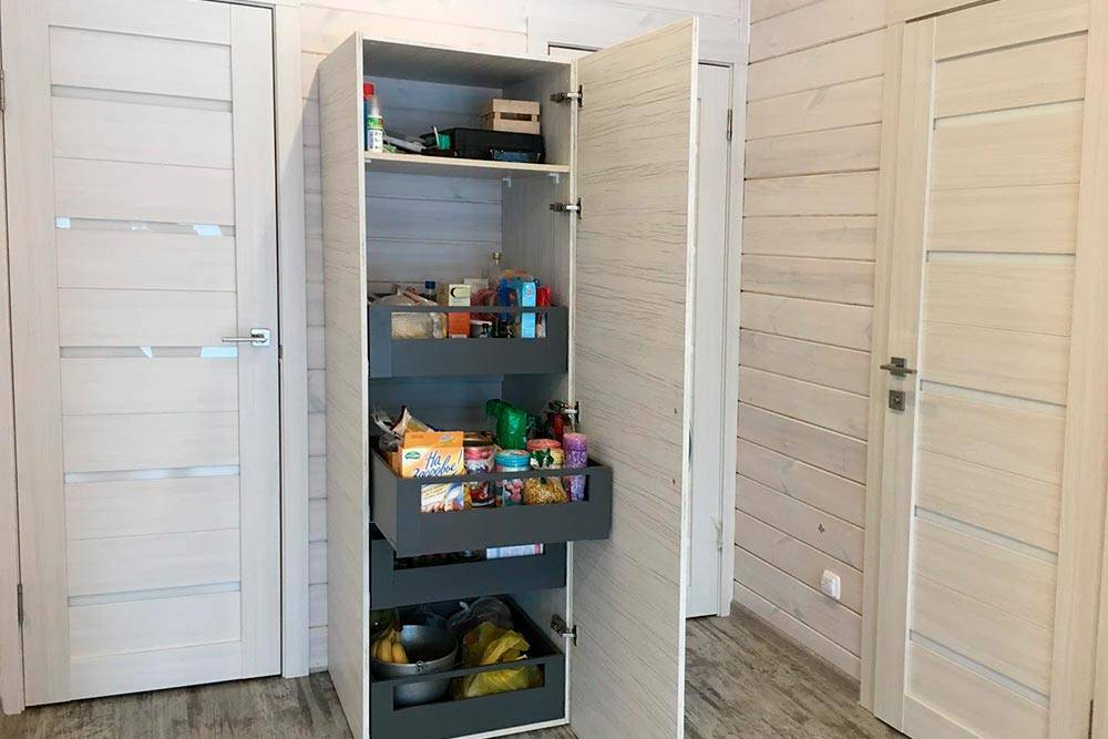 Также мы ошиблись при планировке места под кухонный гарнитур. Вся посуда поместилась, но не нашлось ящика для хранения круп, овощей и разных сухих продуктов. Тогда мы заказали отдельно стоящий шкаф-пенал с распашным фасадом и пятью выдвижными ящиками. Его мы разместили возле стены, которая разделяет наши спальни.