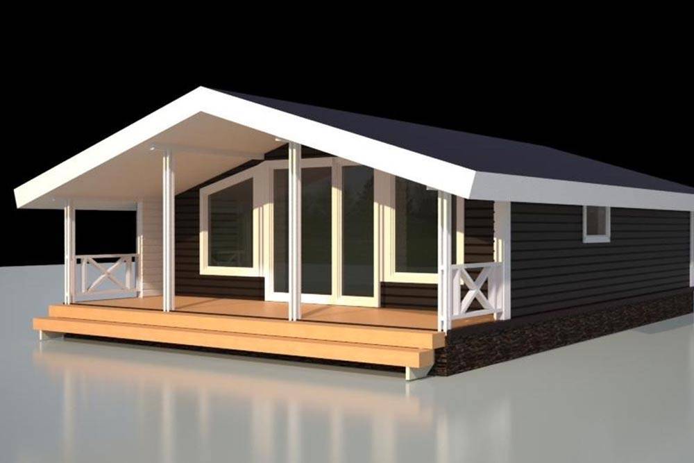 Мы выбрали одноэтажный модульный каркасный дом площадью 63,5 м² с террасой 16 м². Остановились на нем из-за современного внешнего вида.