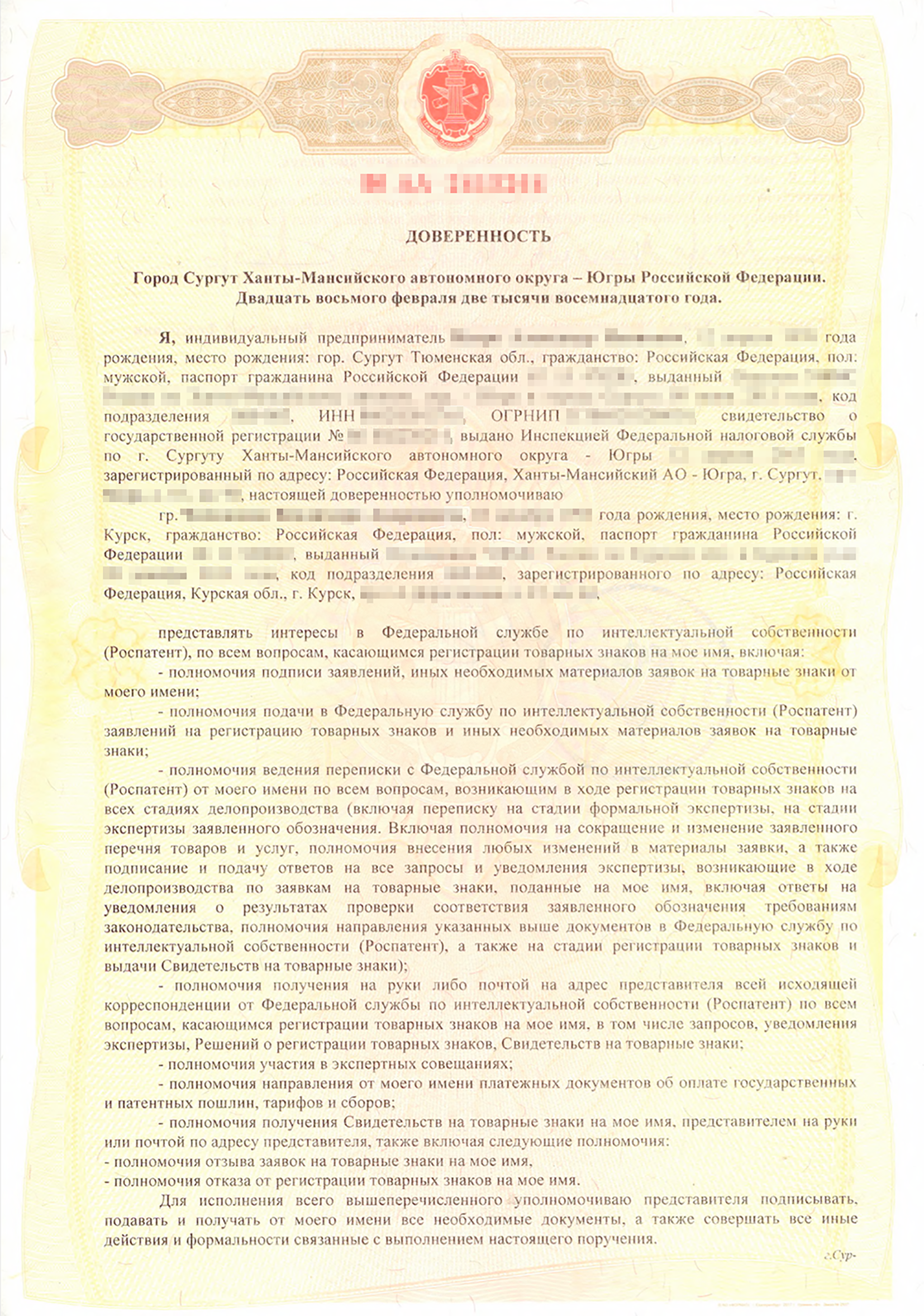 - Доверенность на представление документов о регистрации индивидуального предпринимателя или юридического лица в налоговый орган.