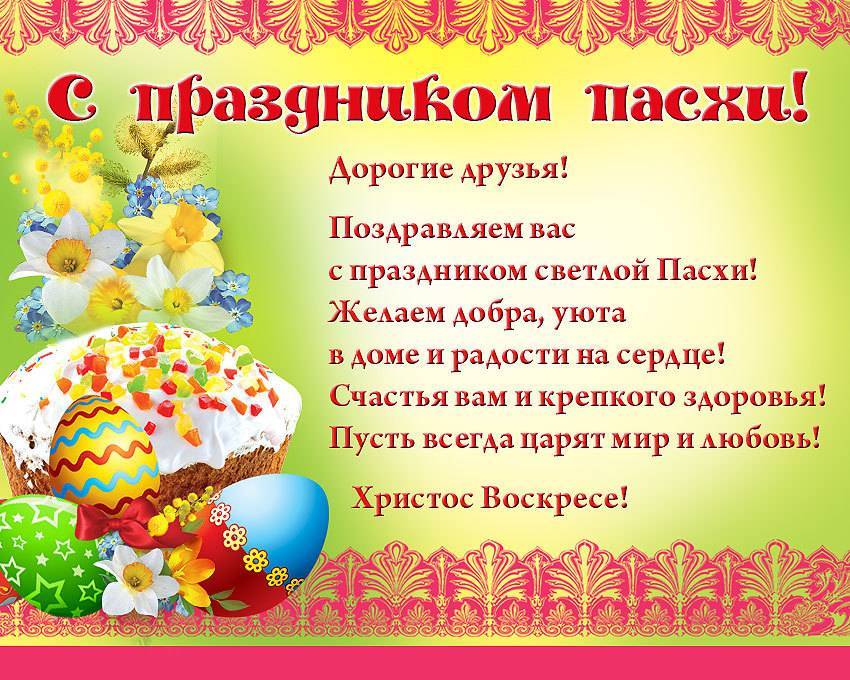 | Felicitaciones a la feliz Pascua! Pascua nos llena de esperanza, alegría y calidez. Os deseamos celebrar esta fiesta con su familia, amigos y seres queridos. ¡Cristo ha resucitado! | Поздравляем со светлым праздником Пасхи! Пасха наполняет нас надеждой, радостью и душевным теплом. Желаем вам встретить этот праздник в кругу семьи, друзей и близких. Христос воскрес! |